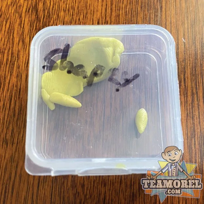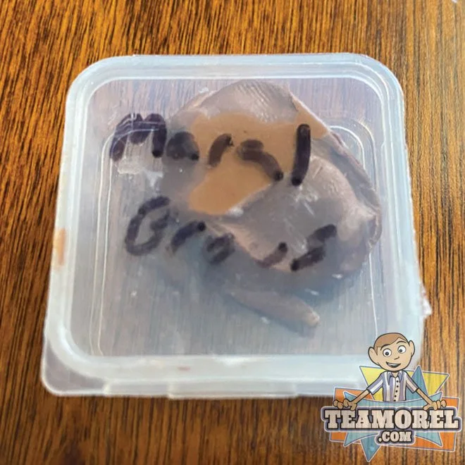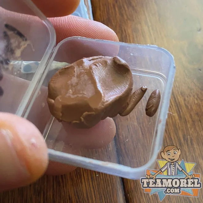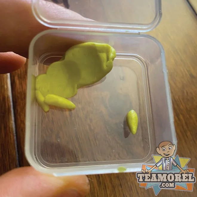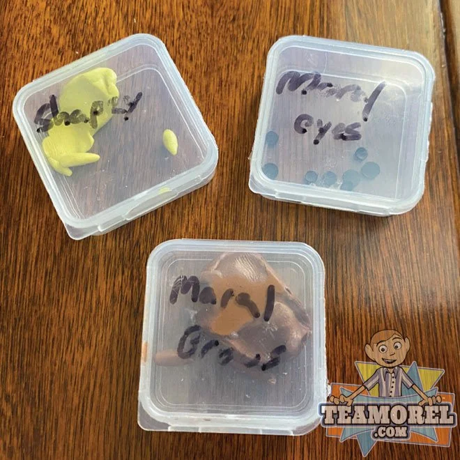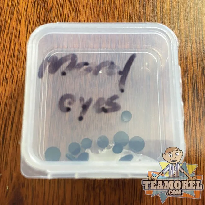 Here we have three different plastic tubs filled with some material that was used on the show. One is called Shapey, Moral Eyes, and Moral Brows. While researching this item, a source told us “The eyebrows were a mix of clay and wax. They said the production team used a double boiler to melt the clay and wax together and the animators would shape that into eyebrows/eyelids. The preparation was to make a blend that would both slightly harden the clay, as well as provide that “anti bleed effect. The Eye Material is made of Black sheet styrene (relatively thin), then leather Hole punched. The material has been officially authenticated but its origins are not 100% confirmed. One source told us that due to the writing on the containers these could be from the set of Beforel Orel. Another source (the source who provided the item) said the EYES are for Bartholomew. The black eye circles are smaller than other puppets but are the exact size of Bartholomew’s eyes which was confirmed when analyzing Season Two - Episode #2: “Love”. It is also possible that the BROWN and YELLOW material were used on the episode “LOVE” due to matching the same color as Shapey’s and Orel’s eyebrows. Regardless of where this material is used, we are insanely blessed to acquire these pieces from the show.